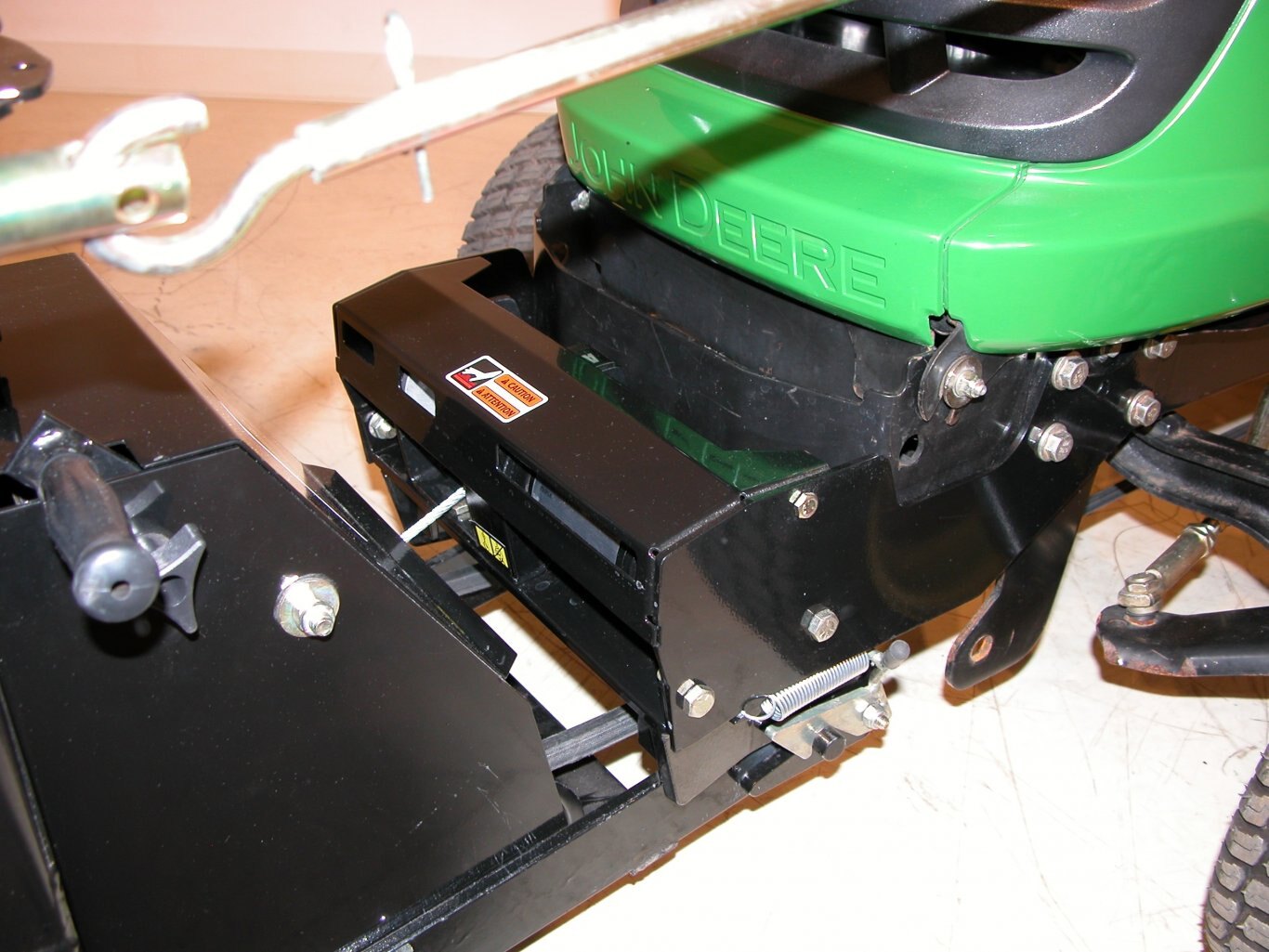 • Once the bolt-on-brackets are mounted to the tractor, they may remain on permanently with no interference with the mower deck.