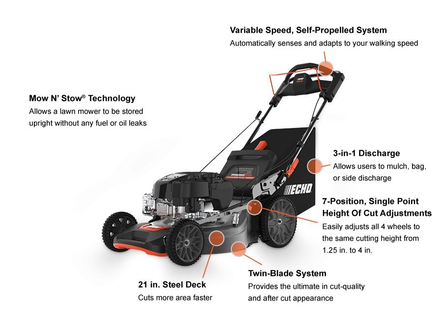 The ECHO LM-2119SP Self-Propelled Mower, designed for up to an acre, features a 190 cc Briggs & Stratton® engine, variable-speed self-propelled system, and Mow N’ Stow® for easy storage. It offers a 3-in-1 cutting system, dual blades, and adjustable mowing height for excellent performance on various terrains. |