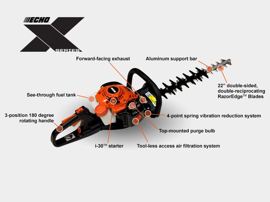 UNE PERFORMANCE INÉGALÉE21.2 cc moteur 2 temps de qualité professionnelle Pour des performances et une durabilité exceptionnelles 3-position, 180-degree rotating rear handle Augmente la maniabilité et offre des options d'orientation de fonctionnement 22 Lames RazorEdge® à double face et à double réciprocité Dispose de trois bords aiguisés pour une coupe plus efficace. Barre de support en U en aluminium et lames évidées Réduit le poids pour une manipulation plus facile et une réduction de la fatigue Échappement orienté vers l'avant Prévient les dommages aux plantes Système de suspension à ressort complet Réduit les vibrations pour le confort de l'opérateur système de démarrage i-30 Reduces starting effort by 30% Système de filtration d'air accessible sans outil Pour un entretien facile et pratique sur le terrain 12.5 fl. oz. capacity see-through fuel tank Pour un contrôle facile du niveau de carburant |