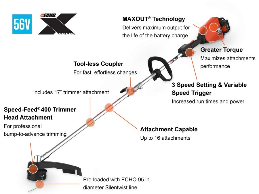 PUISSANCE À TRAVERS TOUT TOUTE LA JOURNÉEPuissant moteur sans balais Fournit des performances comparables à celles du gaz Coupleur sans outil et polyvalence Permet de changer rapidement et facilement jusqu'à 16 accessoires différents Trois réglages de vitesse Pour optimiser les performances de coupe et prolonger la durée de vie de la batterie Accélérateur à vitesse variable Correspond aux conditions de coupe largeur de coupe 17 in Augmente l'efficacité de coupe Tête Speed-Feed® 400 chargée d'un fil de coupe de 0,095 in. dia. Ligne de coupe Silentwist Se recharge en quelques secondes sans démontage Couple de type gaz Pour des performances de coupe supérieures Poignées en caoutchouc Identiques à ceux utilisés sur les tondeuses à gaz ECHO Technologie MAXOUT Fournit une puissance maximale jusqu'à décharge complète de la batterie |