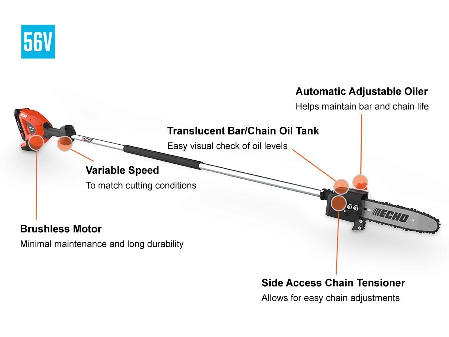 ALIMENTATION PAR BATTERIE ET SÉCURITÉ SUR LE TERRAINPuissant moteur sans balais Fournit des performances comparables à celles du gaz Vitesse variable Pour s'adapter aux conditions de coupe barre et chaîne de 10 po Pour une coupe douce et efficace Jusqu'à 12 ft. de portée, et 15 ft. avec l'extension optionnelle de 3 ft Fournit une portée étendue pour une ébranchage facile avec vos pieds sur le sol Barre translucide/réservoir d'huile de chaîne Contrôle visuel aisé des niveaux d'huile Automatic, adjustable oiler S'adapte aux conditions de coupe pour une consommation d'huile réduite Tendeur de chaîne à accès latéral Permet de régler facilement la chaîne |