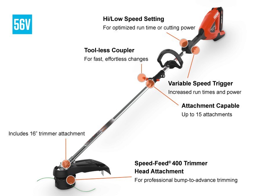 Lightweight lightning. The DPAS-2100SB powerhead, powered by the ECHO 56V Battery System, includes a Speed-Feed® 400 trimmer head attachment. Featuring legendary ECHO power and do-it-all versatility, the powerhead quickly connects to 15 available PAS attachments. |