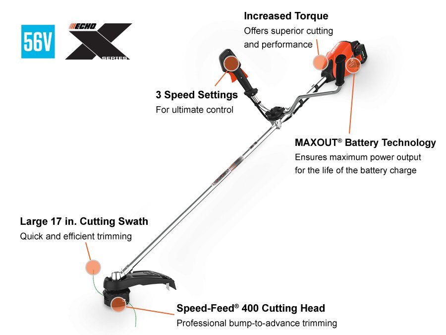 EASY, EFFICIENT, AND ECHO POWERFULPuissant moteur sans balais Fournit des performances comparables à celles du gaz Trois réglages de vitesse Pour optimiser les performances de coupe et prolonger la durée de vie de la batterie Accélérateur à vitesse variable Correspond aux conditions de coupe largeur de coupe 17 in Augmente l'efficacité de coupe Tête Speed-Feed® 400 chargée d'un fil de coupe de 0,095 in. dia. Ligne de coupe Silentwist Se recharge en quelques secondes sans démontage Couple de type gaz Pour des performances de coupe supérieures Poignées en caoutchouc Identiques à ceux utilisés sur les tondeuses à gaz ECHO MAXOUT™ Technology Fournit une puissance maximale jusqu'à décharge complète de la batterie |